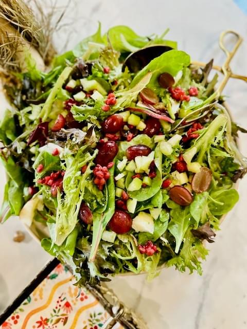 Our Grateful Greens salad is a mix of field greens, celery, red grapes, feta and pomegranate arils with nuts and apple cider vinaigrette on the side. This comes in a 9x13 pan, but we recommend putting it in a prettier bowl for serving if you can.